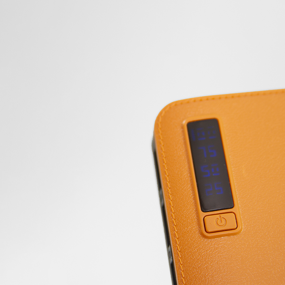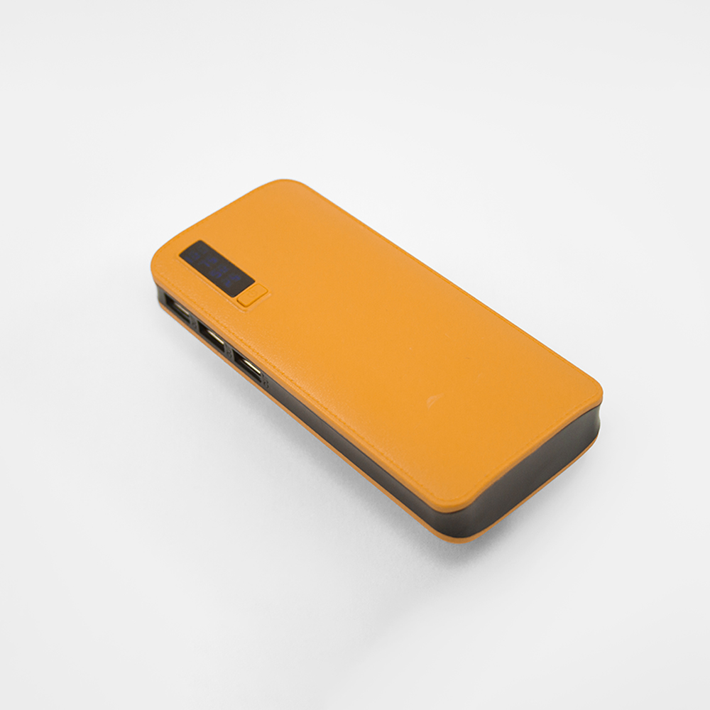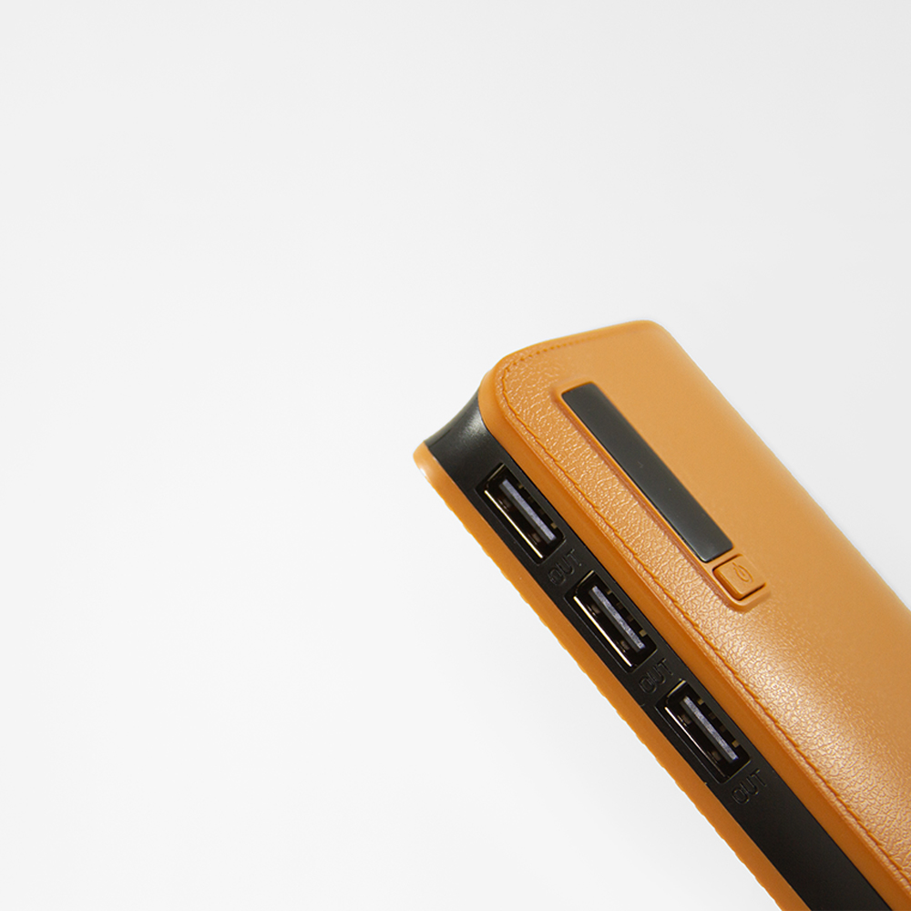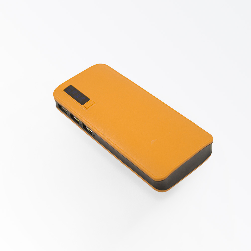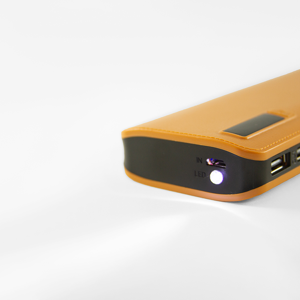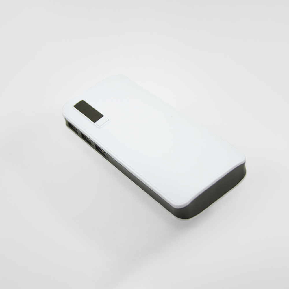 Power bank portátil de plástico con capacidad de 12,000 mAh. Con tres conexiones USB y lampara con un LED. Incluye pantalla LCD que indica el porcentaje de carga y cable micro USB.
