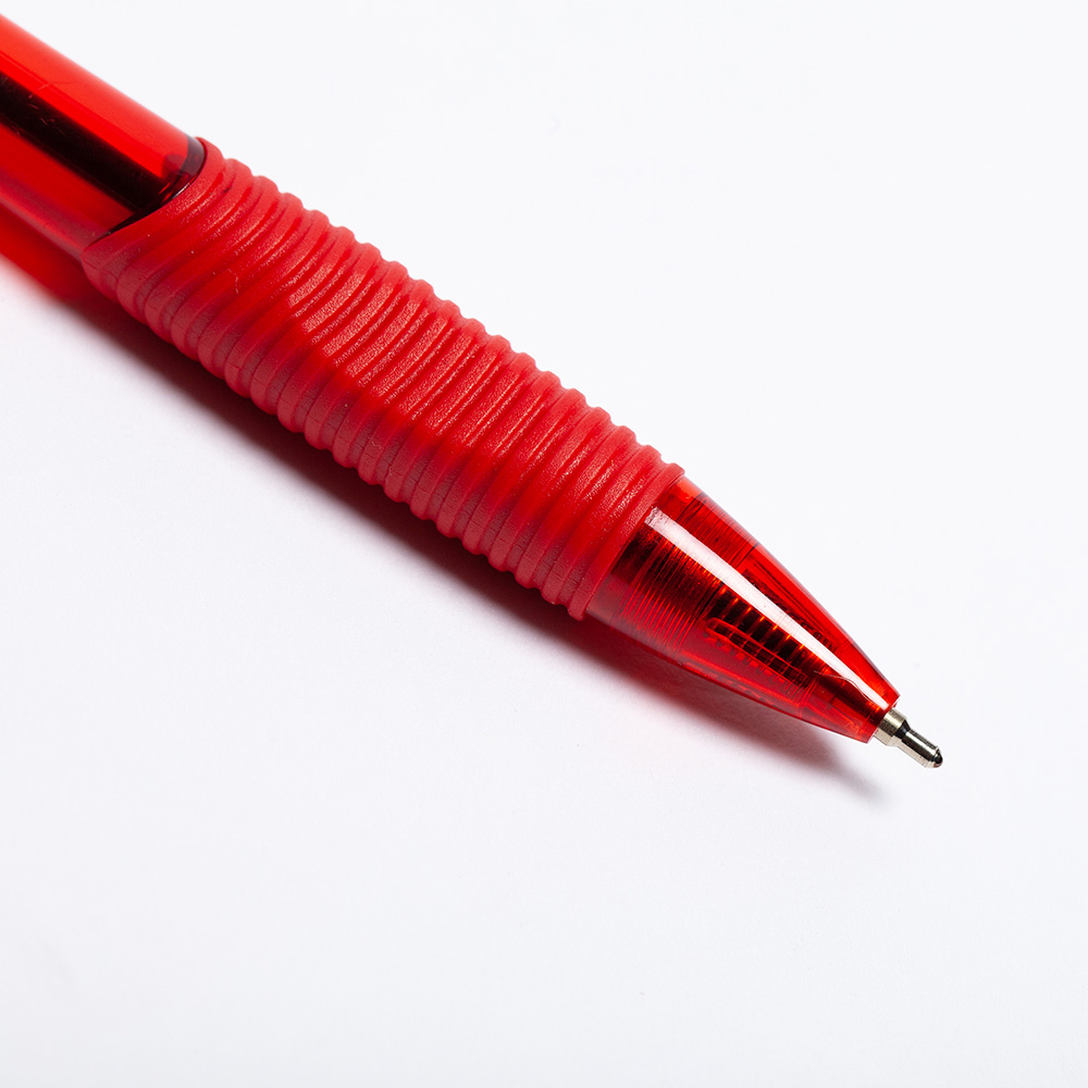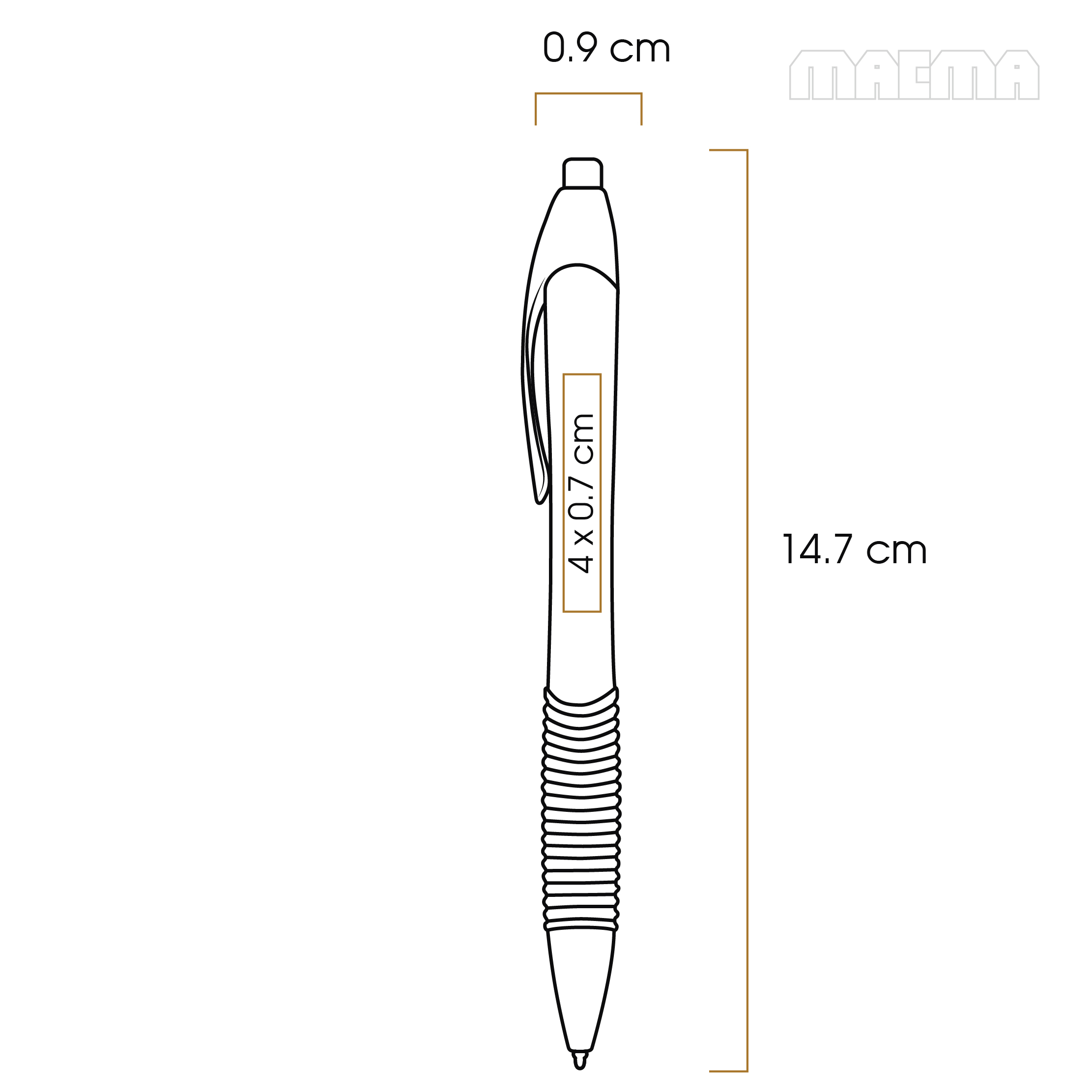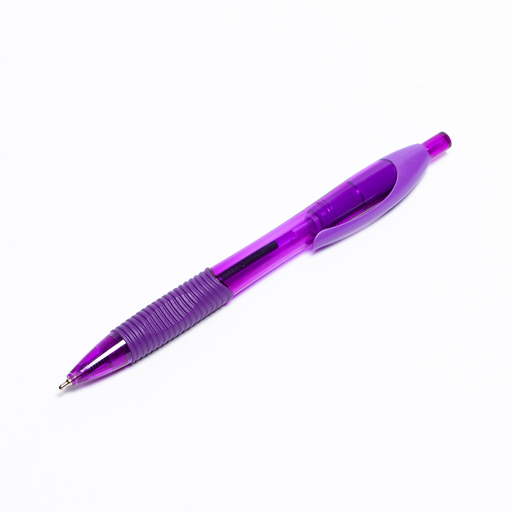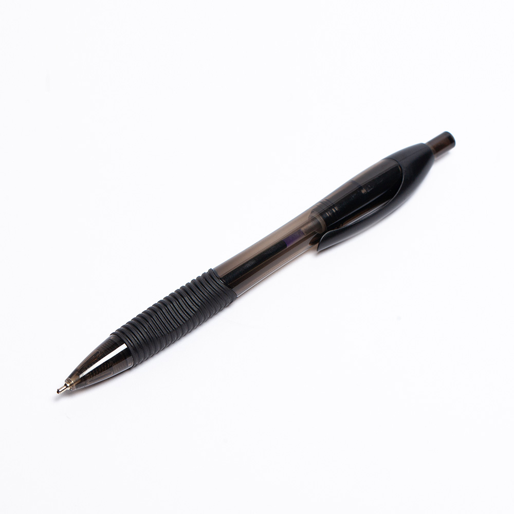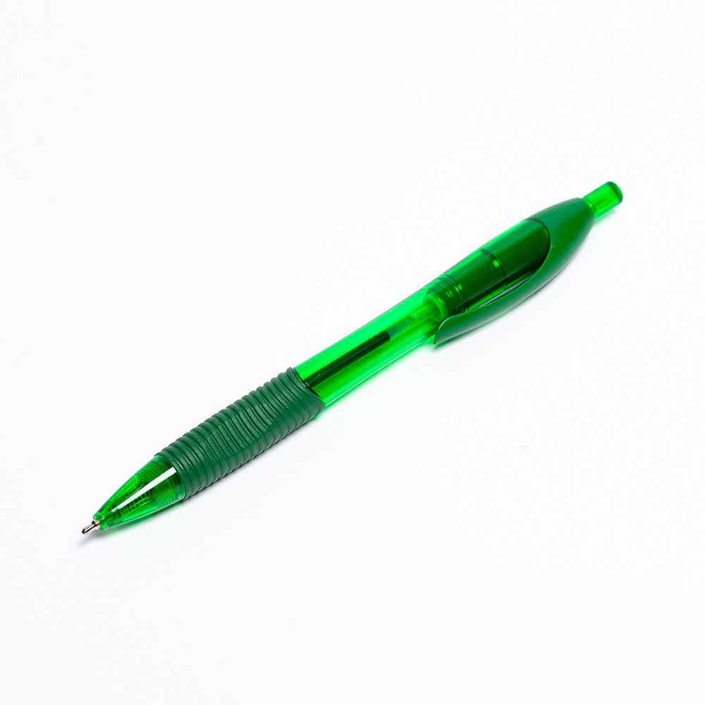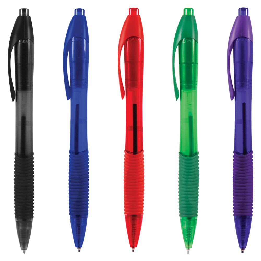 Boligrafo de plestico translucido, zona de sujecion de caucho y tinta de baja viscosidad.