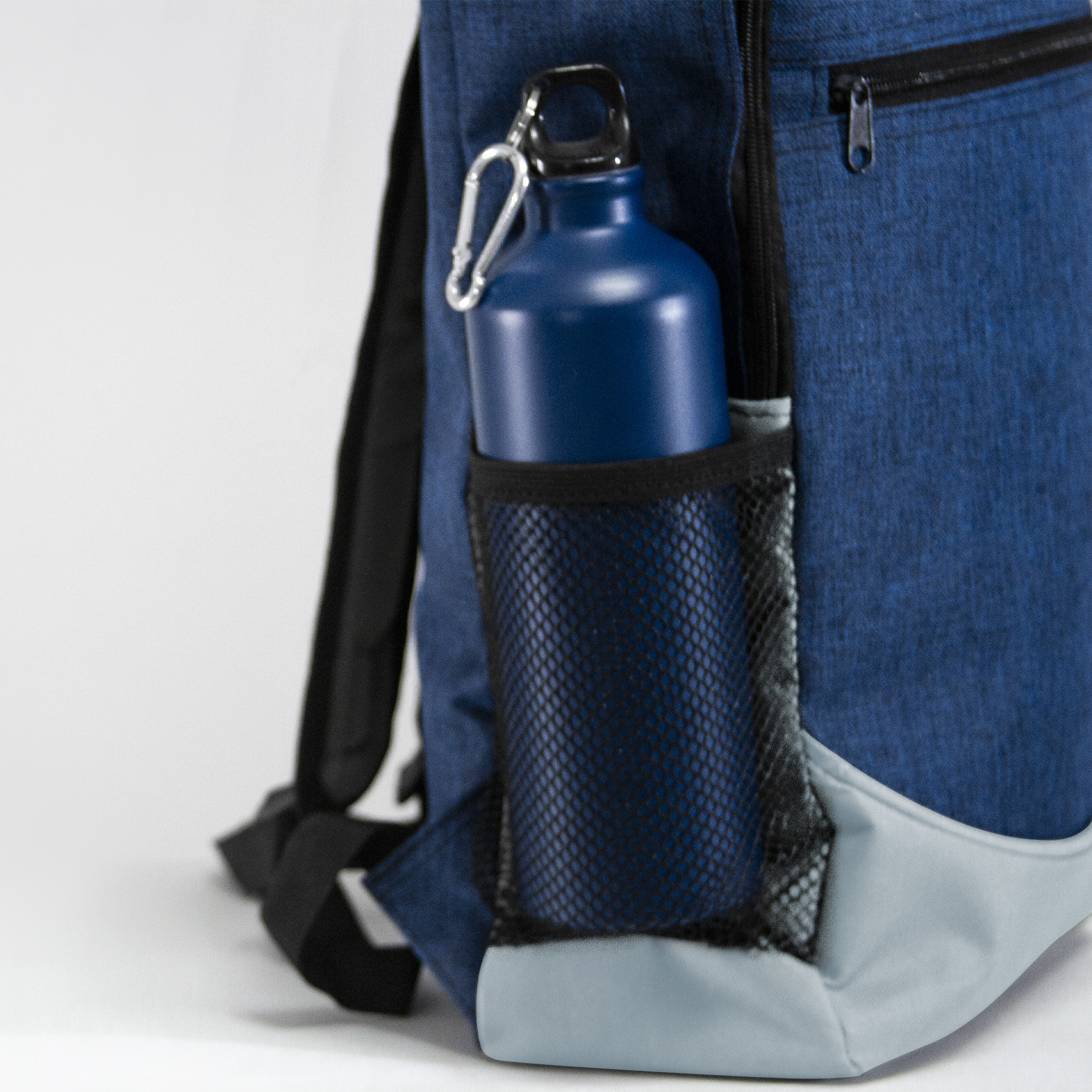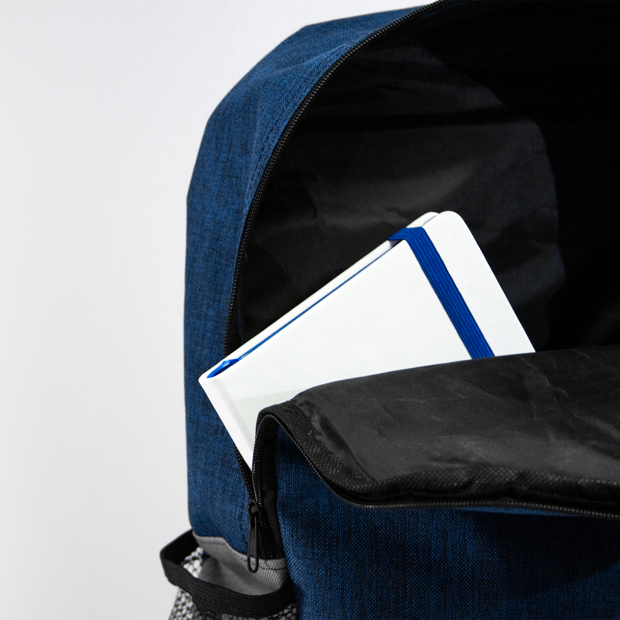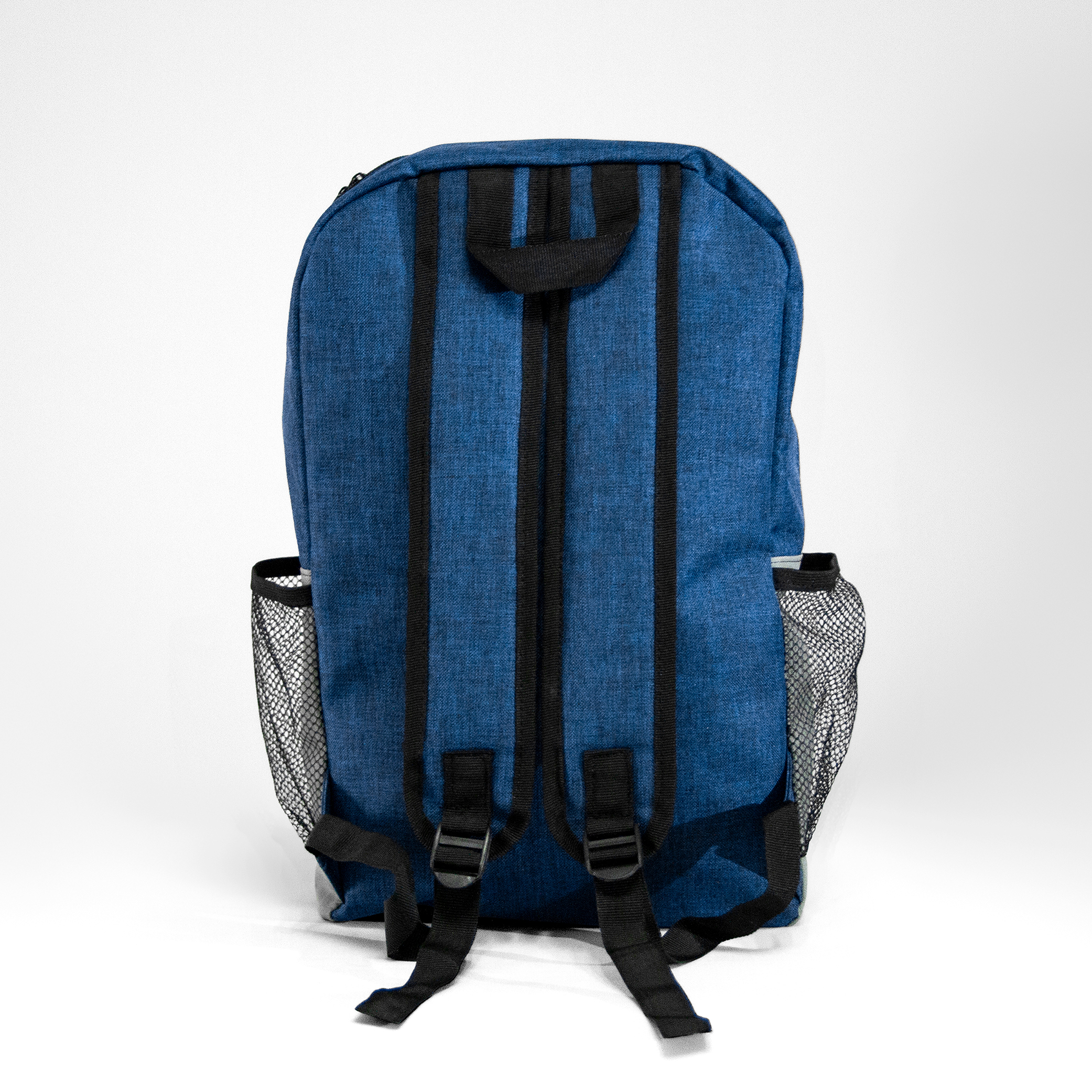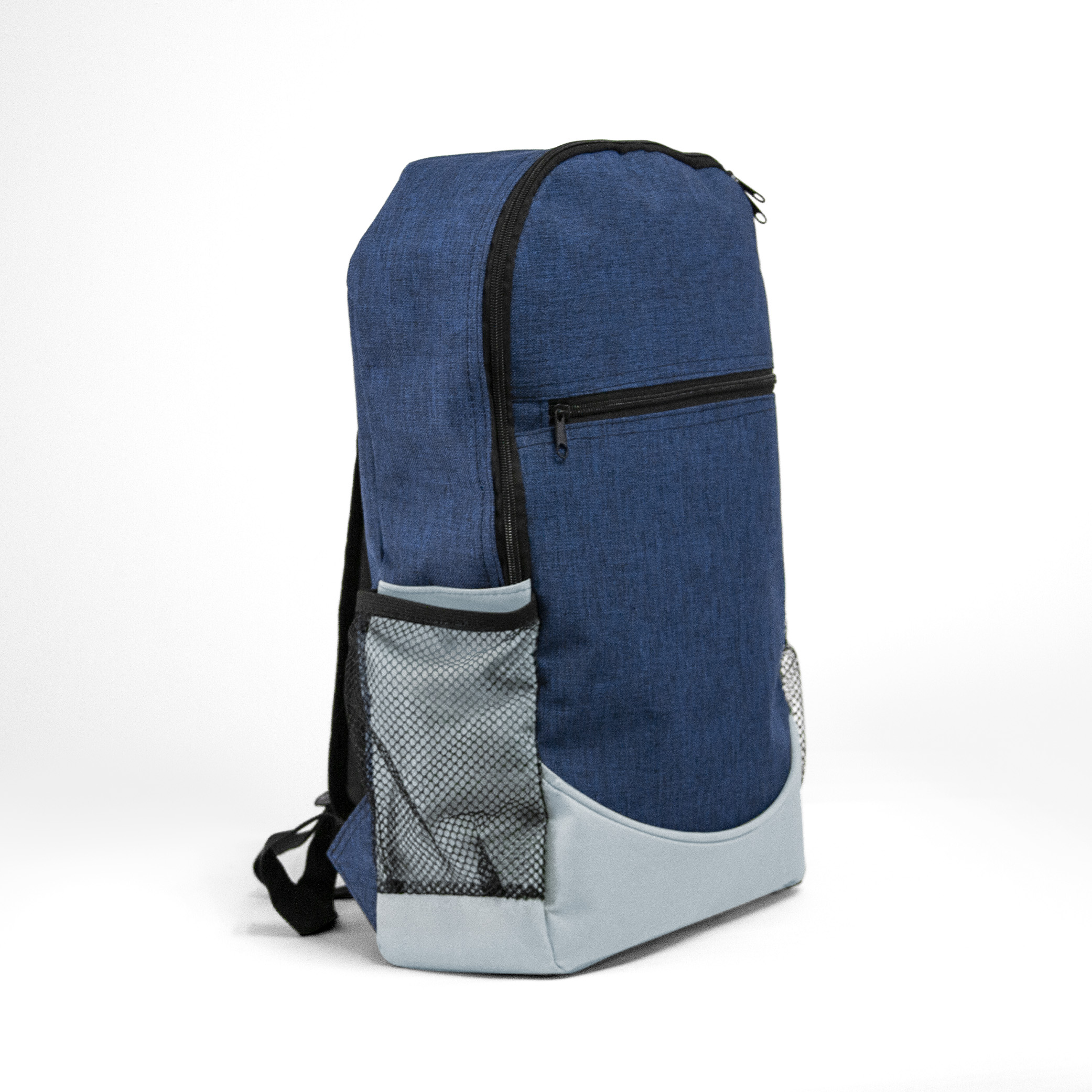 Mochila de poliéster con bolsa principal acolchada. Bolsas laterales de malla, compartimiento frontal y salida para audífonos.