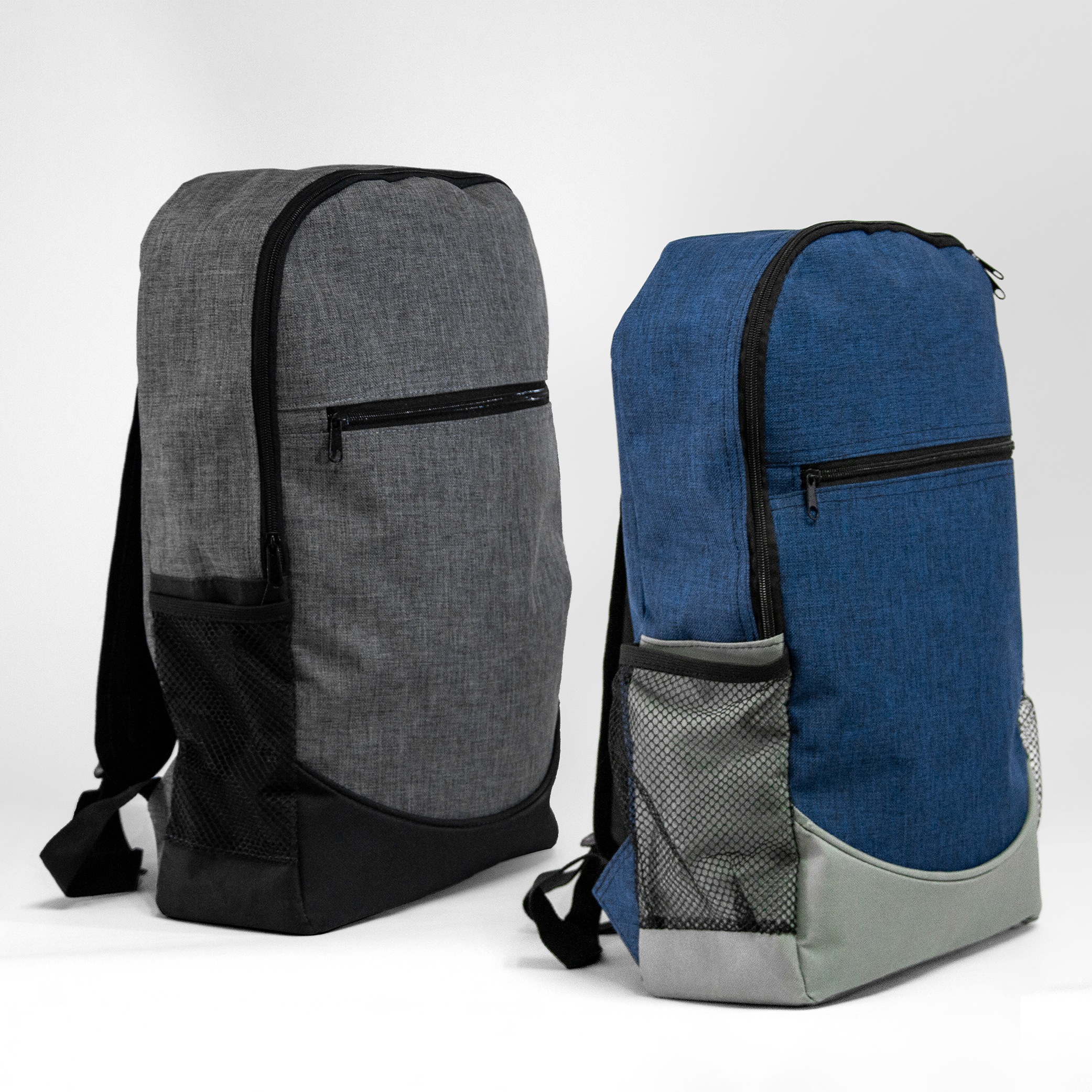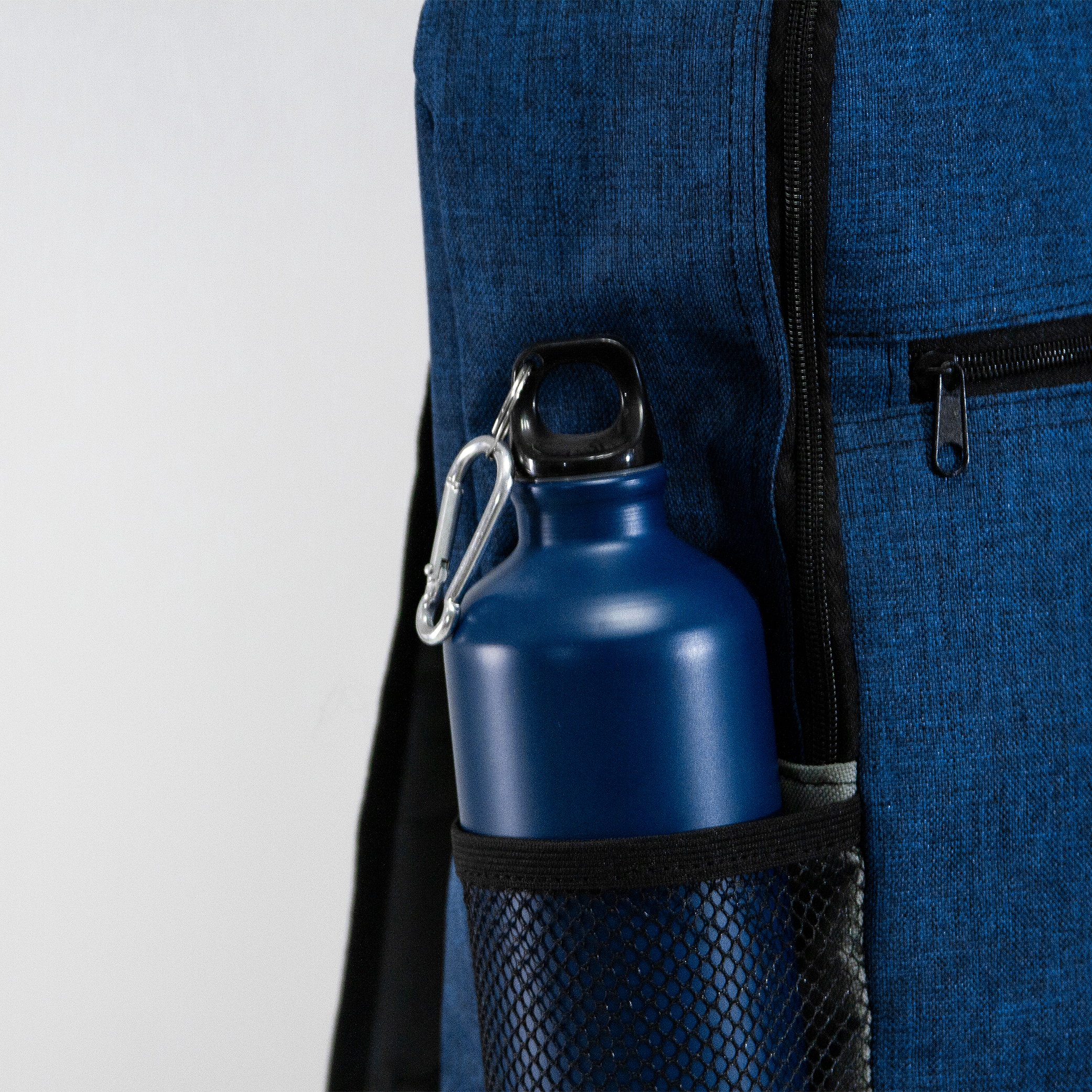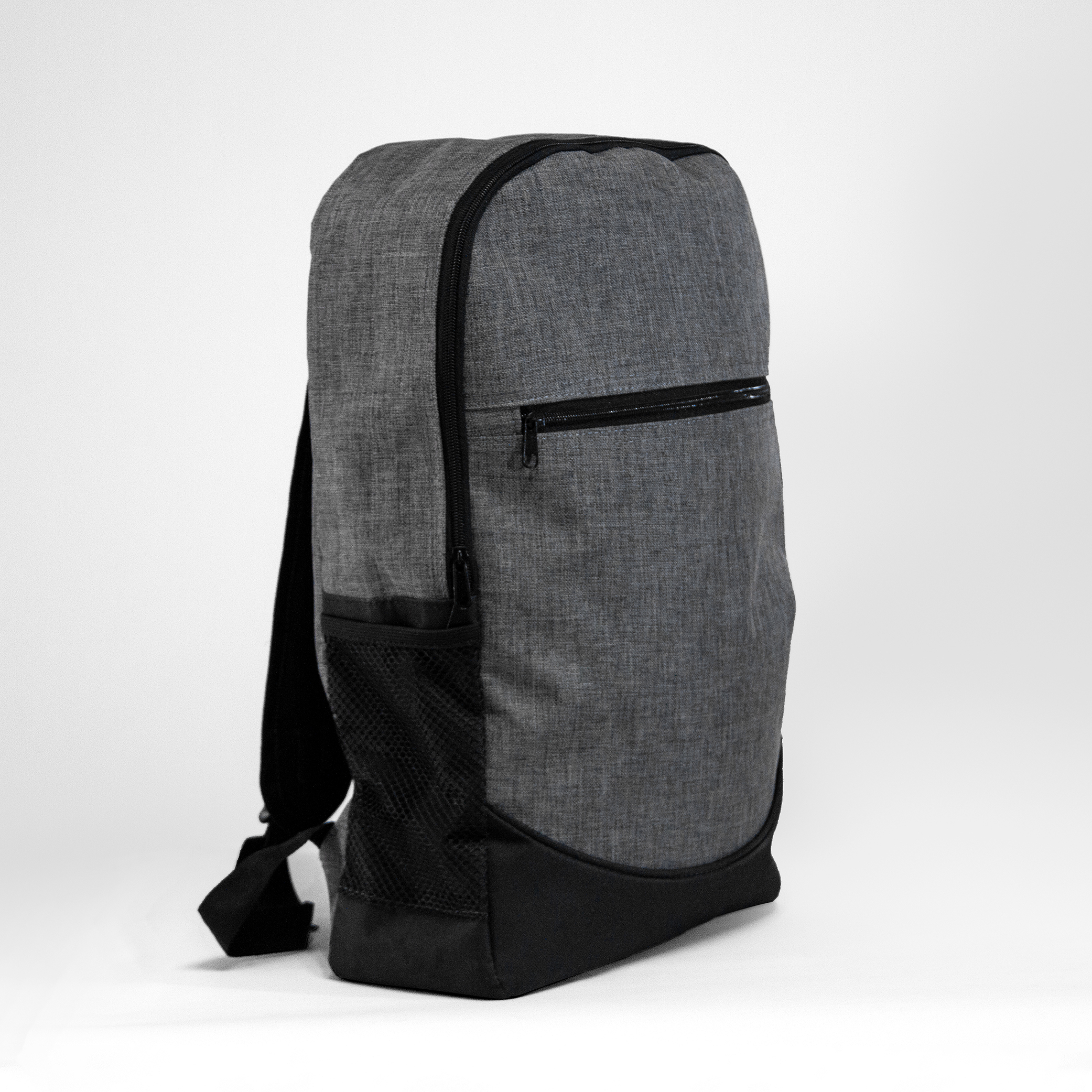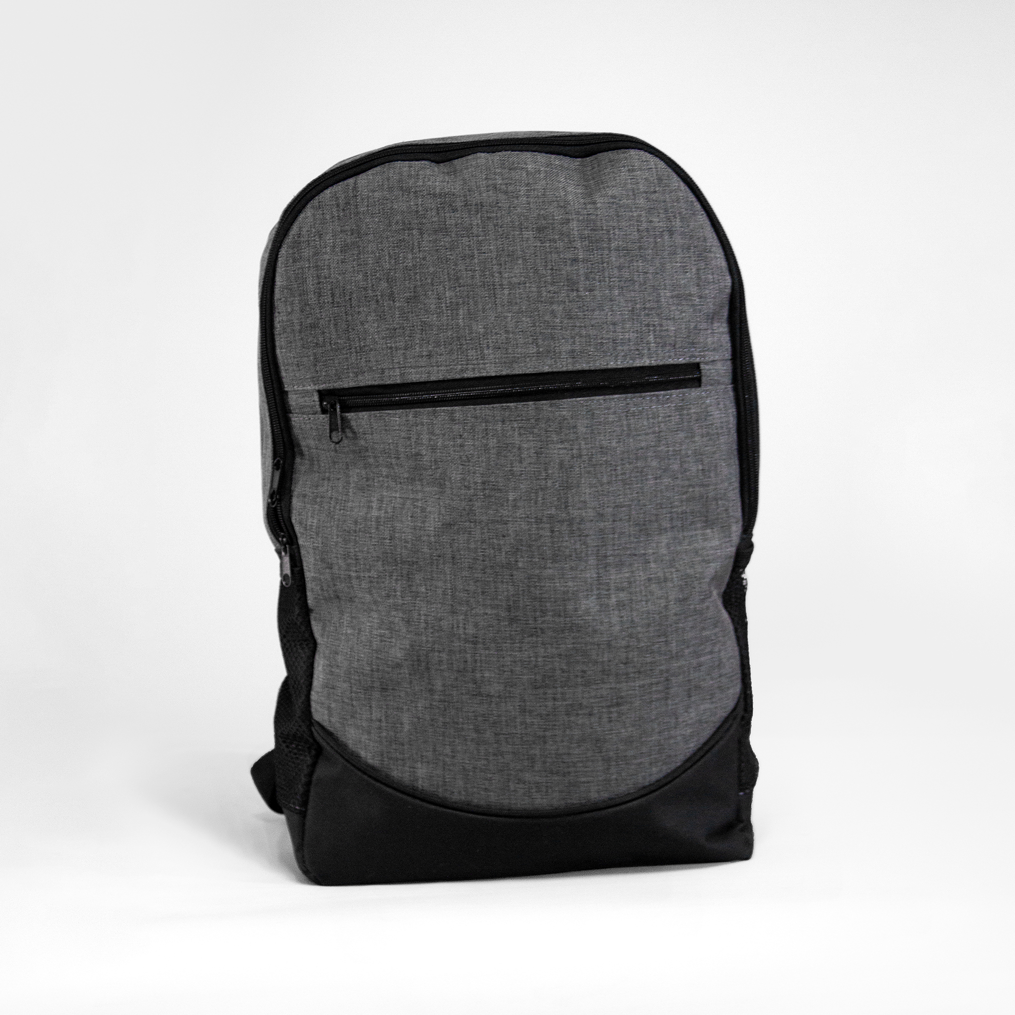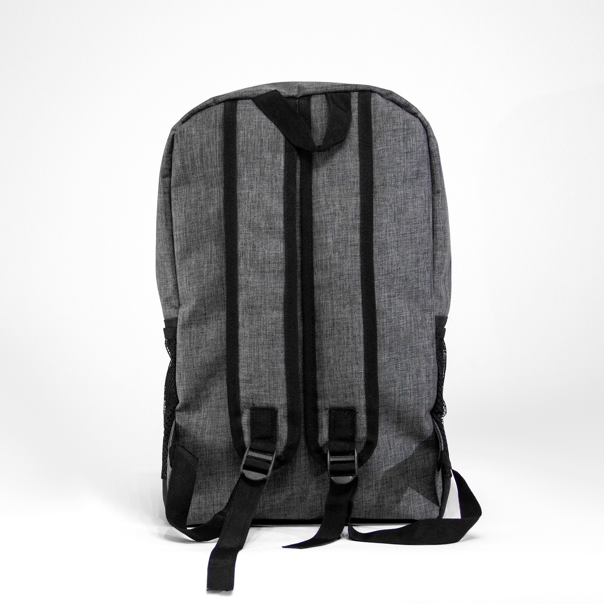 Mochila de poliéster con bolsa principal acolchada. Bolsas laterales de malla, compartimiento frontal y salida para audífonos.