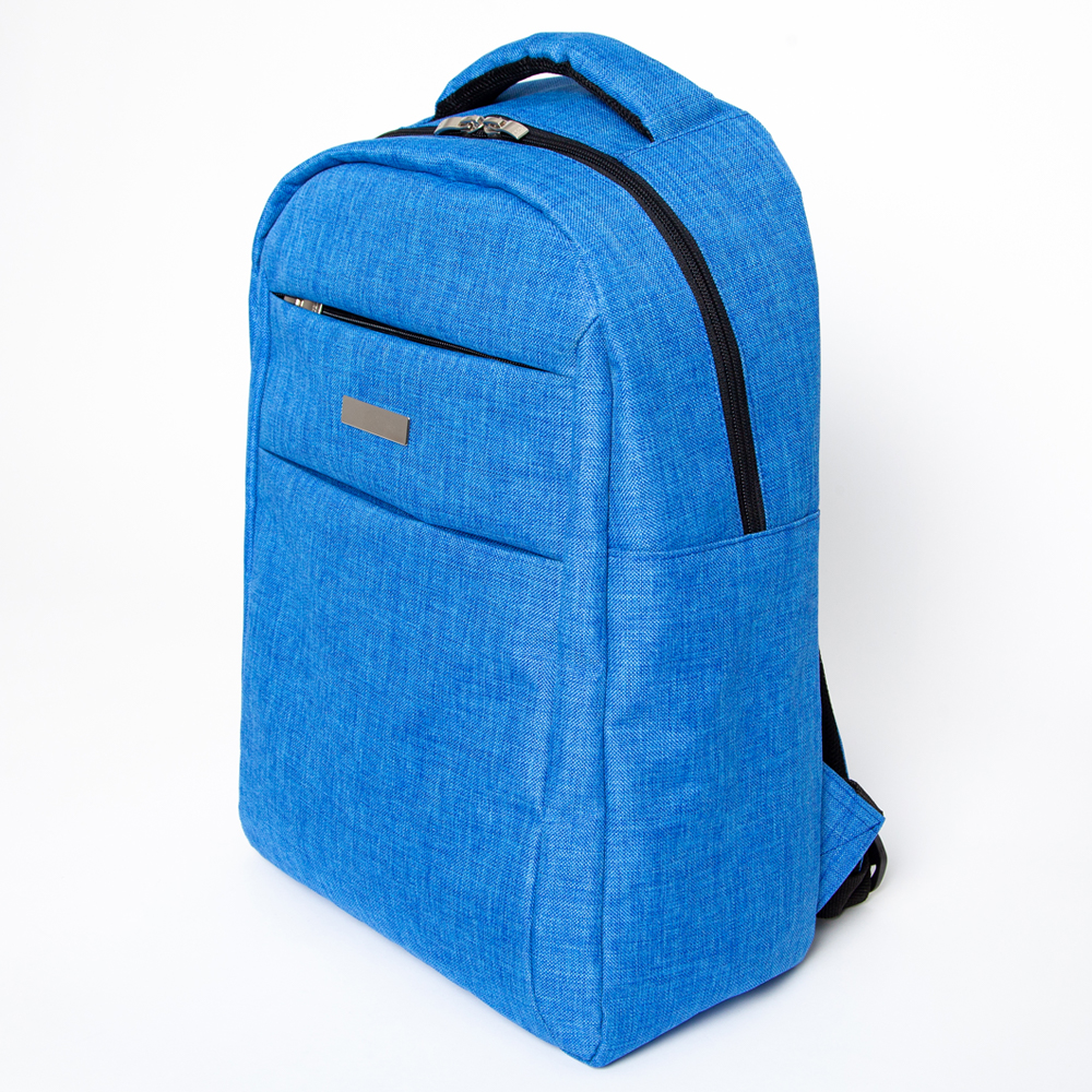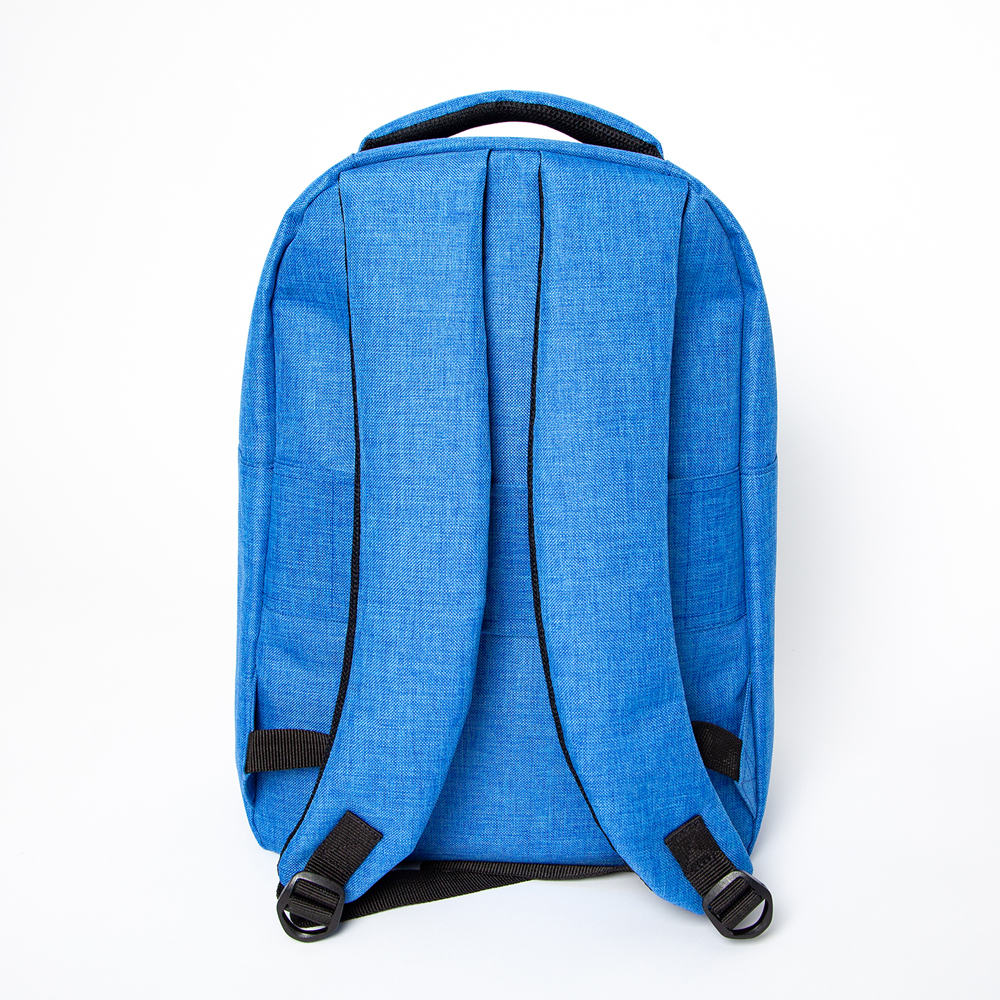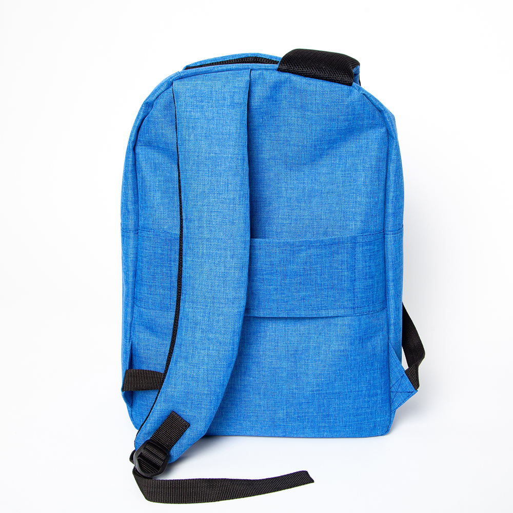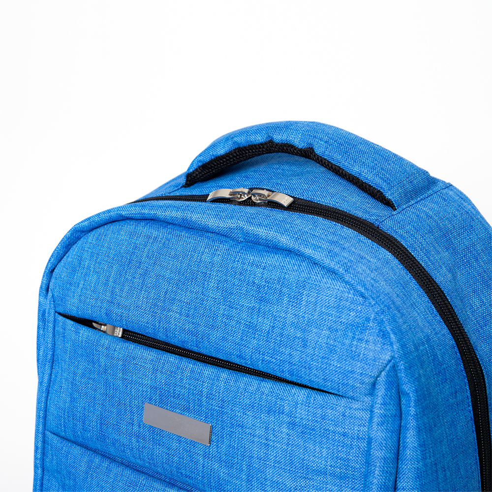 Mochila de poliester 600D con cierres negros y bolsillos frontales. El compartimento principal es ideal para llevar la laptop o porta documentos.