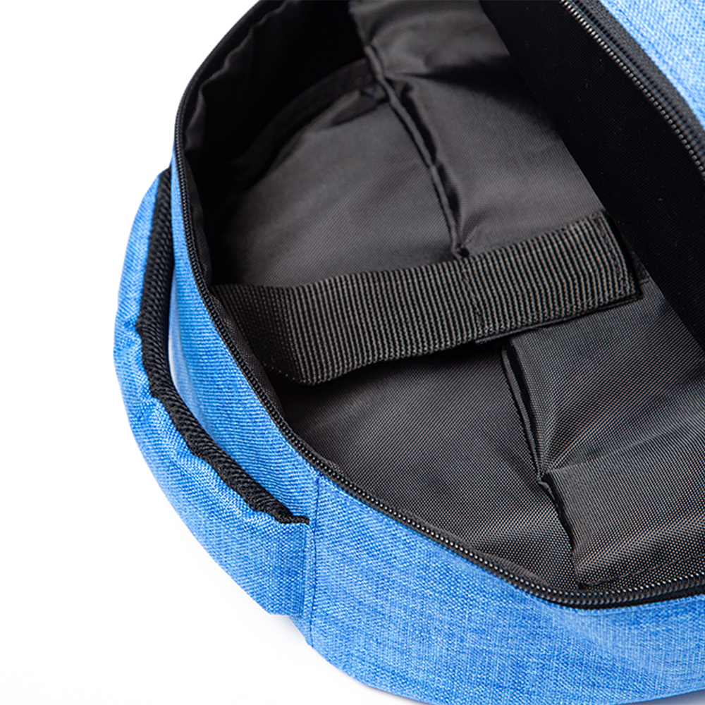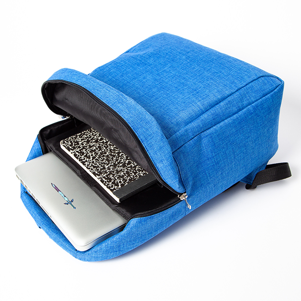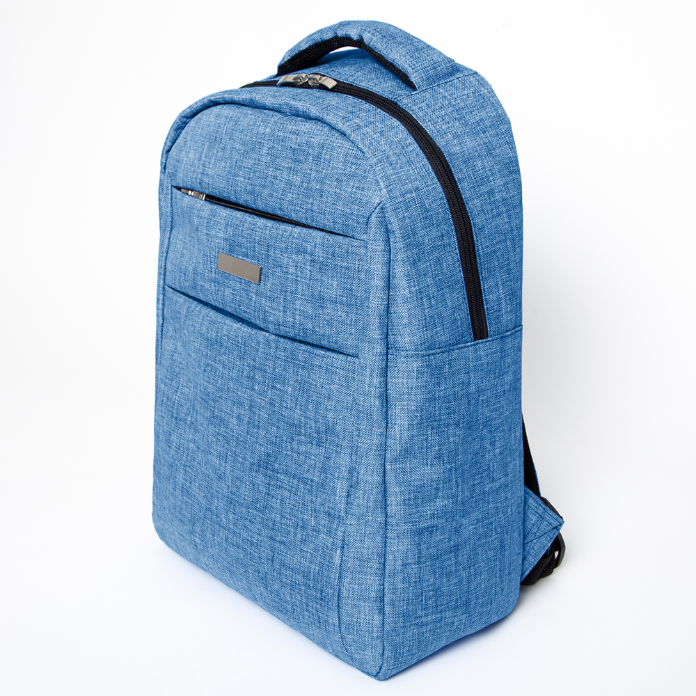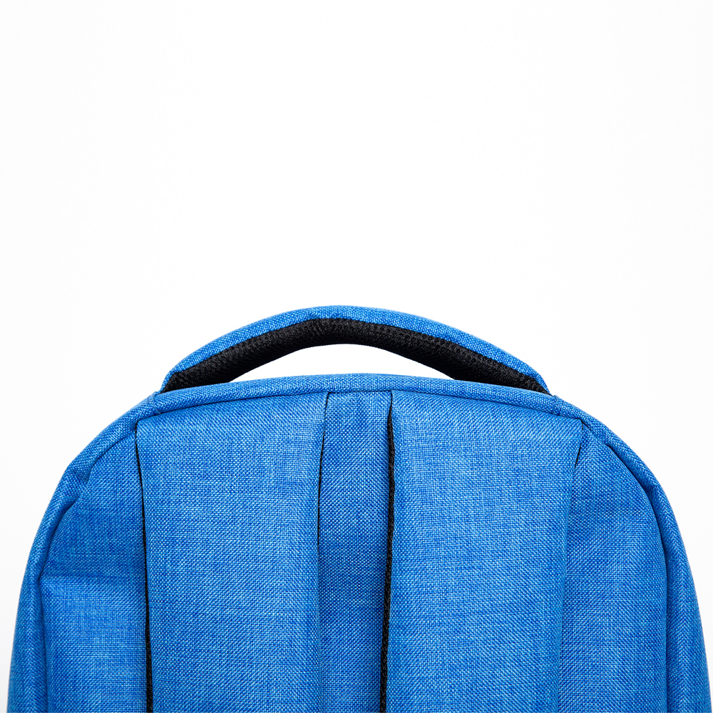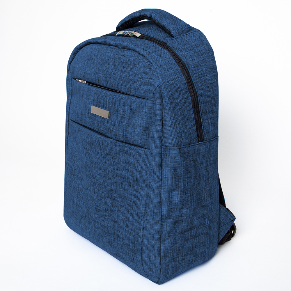 Mochila de poliester 600D con cierres negros y bolsillos frontales. El compartimento principal es ideal para llevar la laptop o porta documentos.