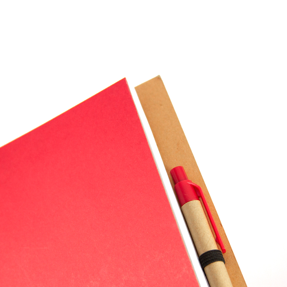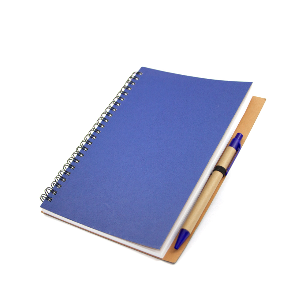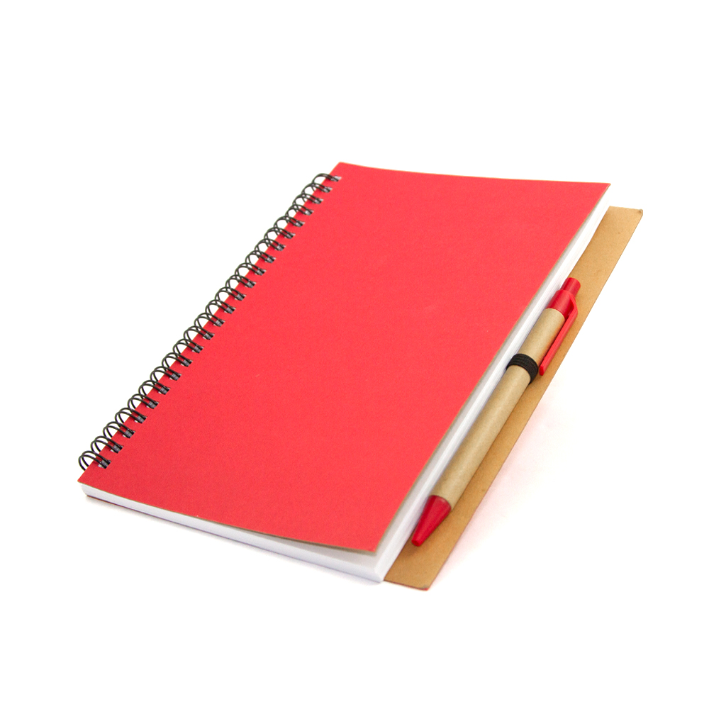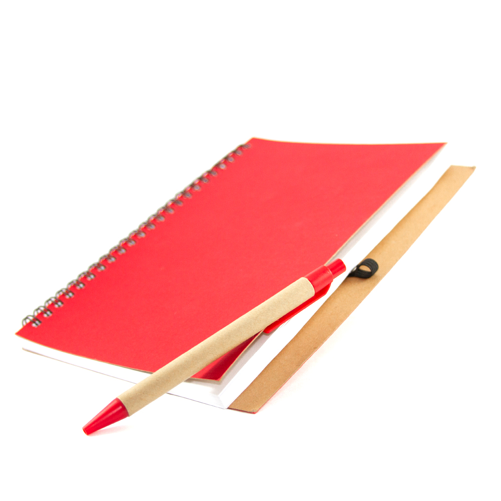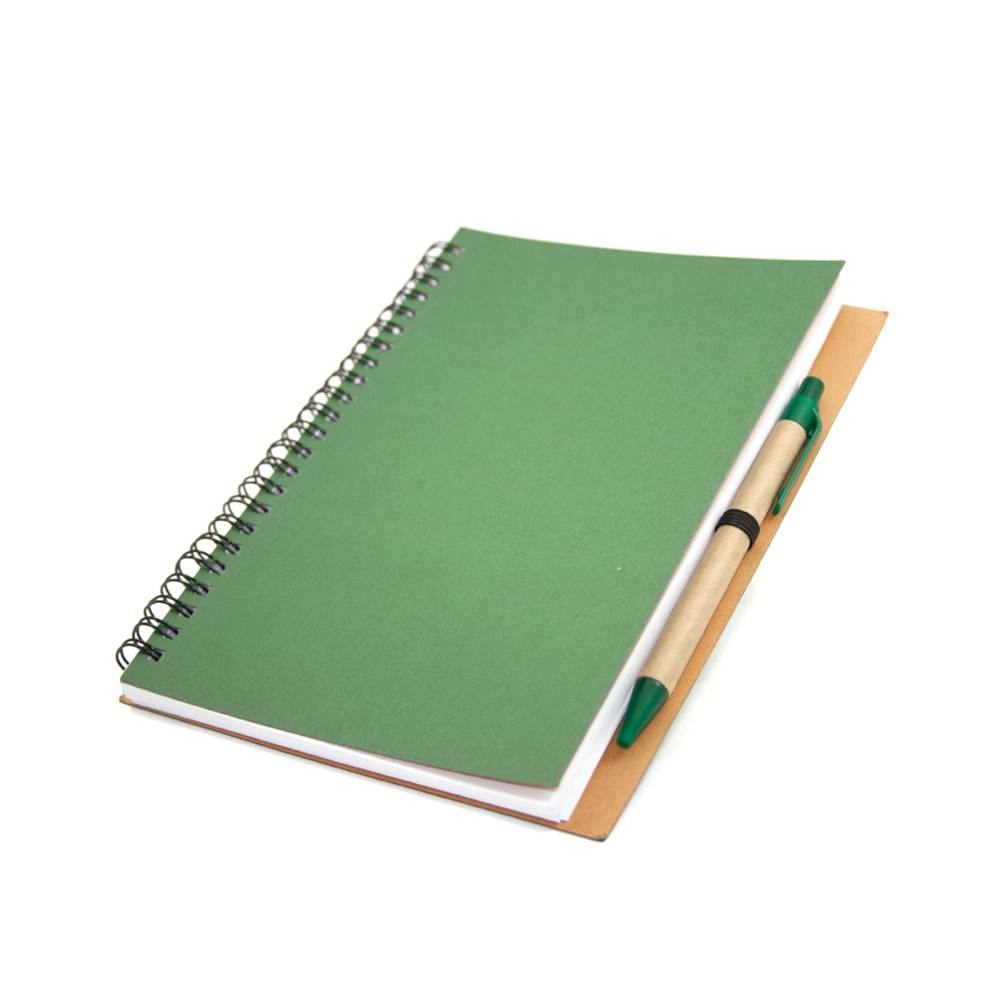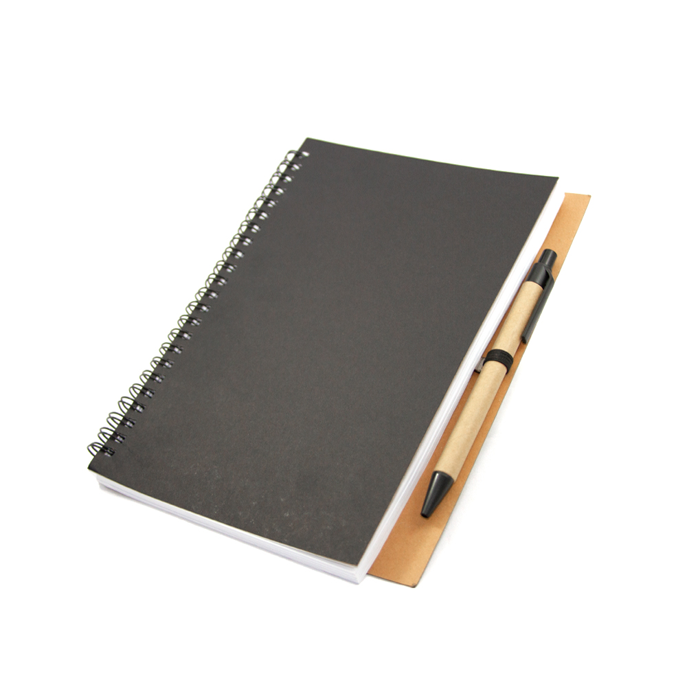 Cuaderno ecológico elaborado con cubierta dura de papel Kfrat y encuadernación de espiral con 80 hojas. Incluye bolígrafo ecológico con mecanismo retráctil.